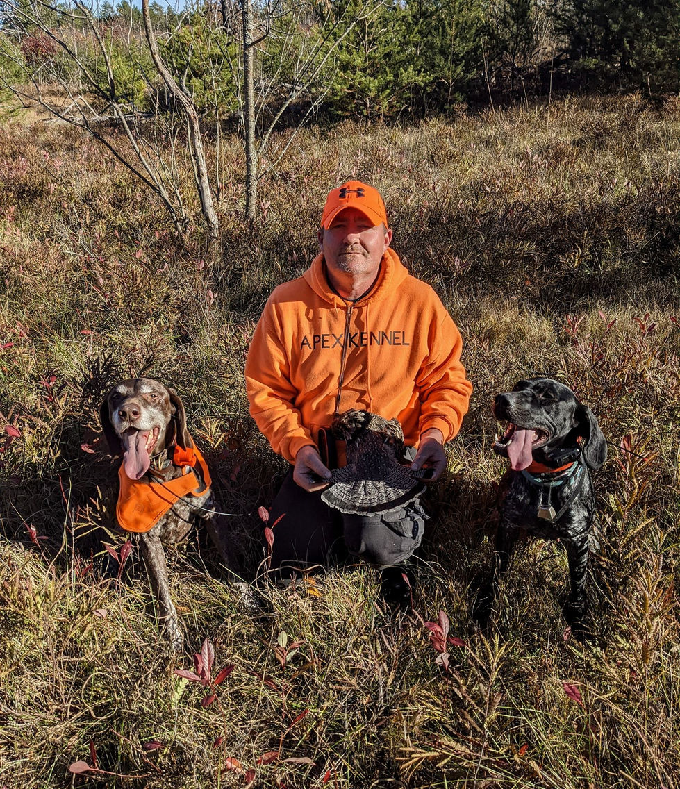 We don't know much of Buddy's past, nor his pedigree. But what we do know is he's the most BADASS bird dog we have ever owned. He is a stubborn asshole, but when you put him in the woods he is on a straight mission for BIRDS. If you're a shit shot, Buddy would retrack the bird until it was in the bag. We may not know his lines, but we do know Buddy being an addition to the Apex crew has been nothing short of an amazing journey. His expericence and wisdom has helped start our younger dogs in the woods and let them experice the skill of a broke wild bird dog.